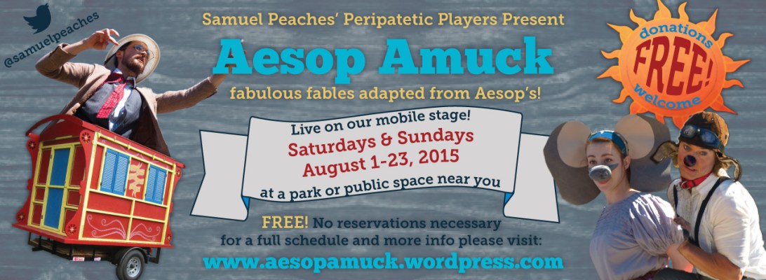 Aesop Amuck opens this Saturday, August 1 at DeFremery Park in Oakland — then we travel to seven more parks and public spaces throughout the Bay Area until August 23.